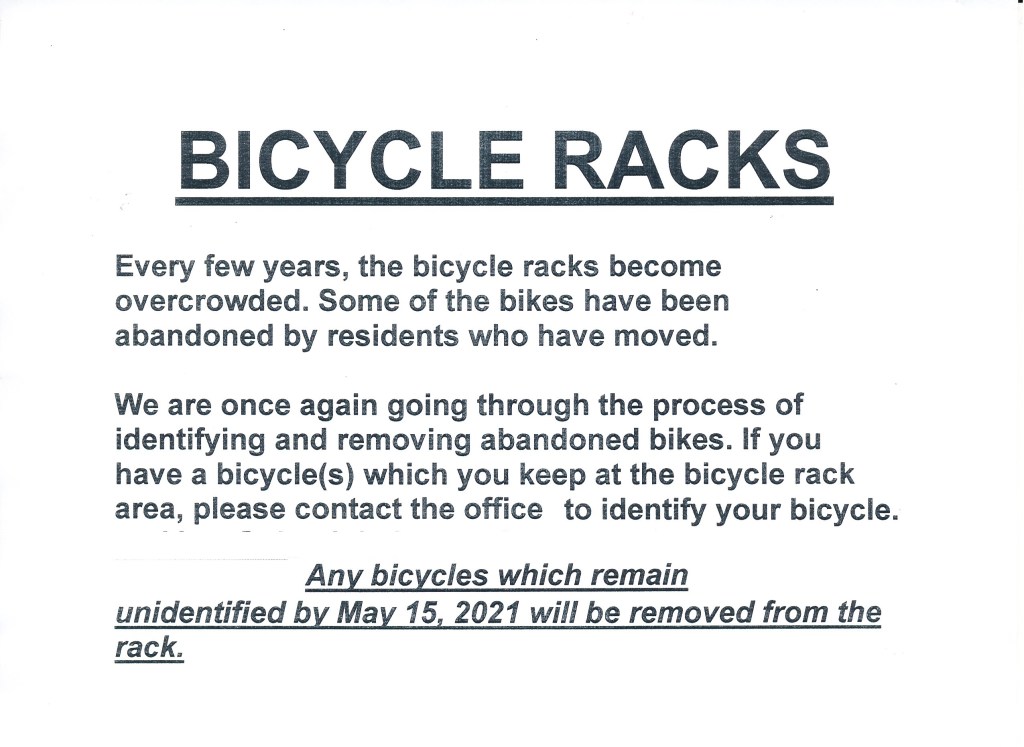 Notice to residents storing their bicycles in the HOA’s bicycle racks On April 9, 2021 By Joe JohnstonIn Notices Share this: Click to share on X (Opens in new window) X Click to share on Facebook (Opens in new window) Facebook Like Loading...