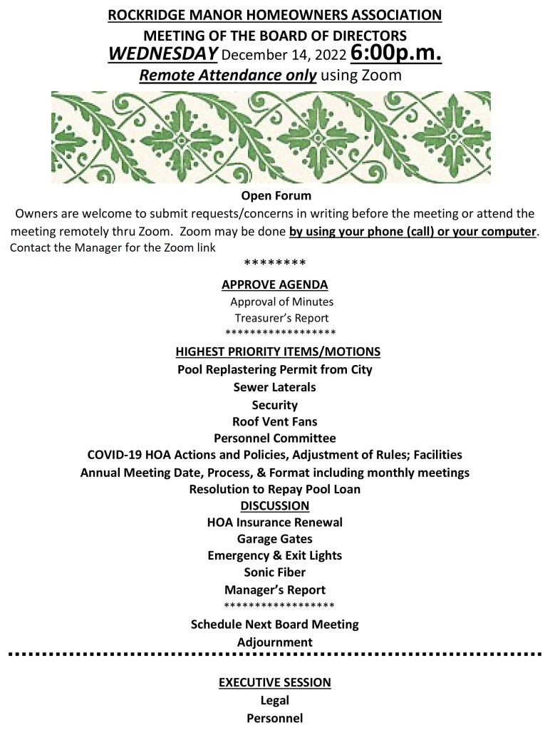 Agenda for December 14 monthly Board meeting On December 11, 2022 By Rockridge Manor HOAIn HOA Business, Notices Share this: Click to share on X (Opens in new window) X Click to share on Facebook (Opens in new window) Facebook Like Loading...