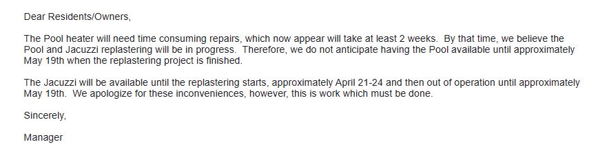 Pool and Jacuzzi availability dates On April 7, 2023 By Rockridge Manor HOAIn Notices Share this: Click to share on X (Opens in new window) X Click to share on Facebook (Opens in new window) Facebook Like Loading...