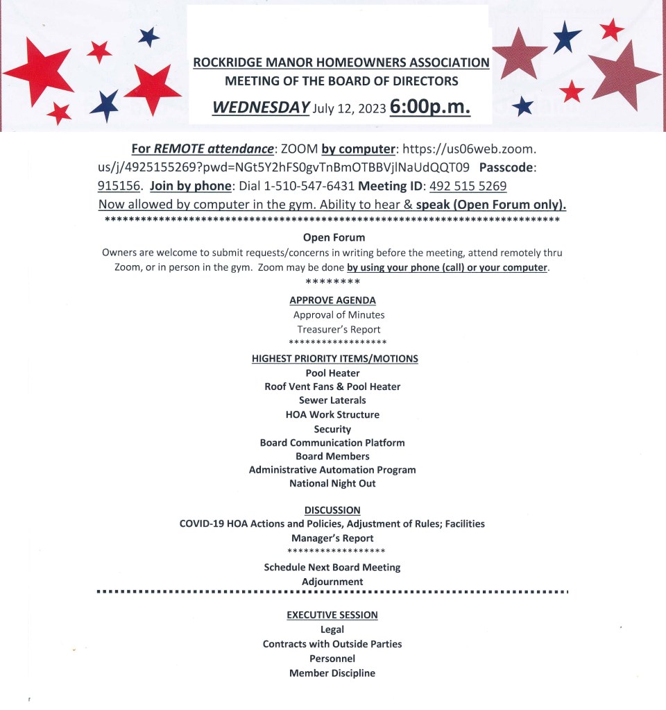Agenda for the July 12, 2023 Board Meeting On July 10, 2023 By Rockridge Manor HOAIn Agendas, HOA Business Share this: Click to share on X (Opens in new window) X Click to share on Facebook (Opens in new window) Facebook Like Loading...