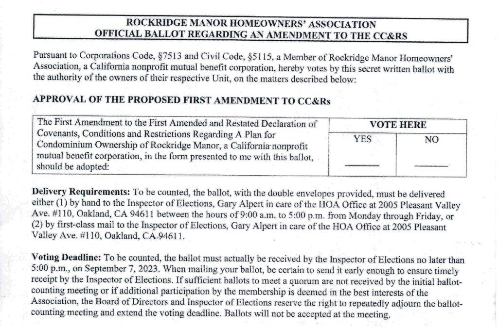 Owners please submit your ballots to annex the pool land by September 7 at 5PM On September 4, 2023September 5, 2023 By Rockridge Manor HOAIn HOA Business It is OK to write your apartment number instead of the lot number on the larger envelope Share this: Click to share on X (Opens in new window) X Click to share on Facebook (Opens in new window) Facebook Like Loading...