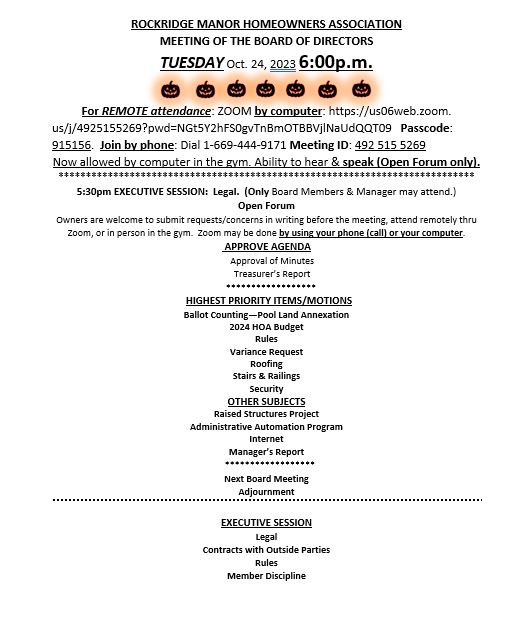 Agenda for October 24 Board meeting On October 22, 2023October 23, 2023 By Rockridge Manor HOAIn Agendas, HOA Business Agenda for RM HOA October 24,2023 Board Meeting Share this: Click to share on X (Opens in new window) X Click to share on Facebook (Opens in new window) Facebook Like Loading...
