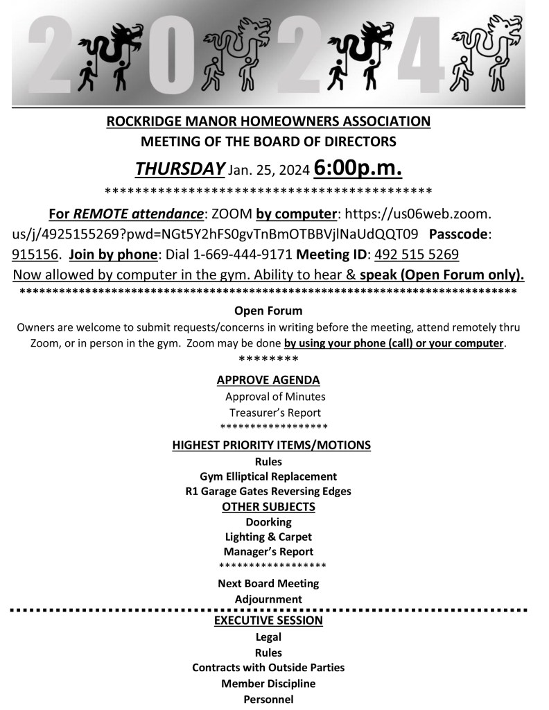 Agenda for the January 25 Board Meeting On January 21, 2024 By Rockridge Manor HOAIn Agendas, RMHOA Board meetings Share this: Click to share on X (Opens in new window) X Click to share on Facebook (Opens in new window) Facebook Like Loading...