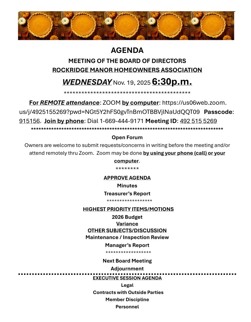 Agenda for the November 19 Board Meeting On November 16, 2025November 16, 2025 By Rockridge Manor HOAIn Agendas, HOA Business Share this: Click to share on X (Opens in new window) X Click to share on Facebook (Opens in new window) Facebook Like Loading...