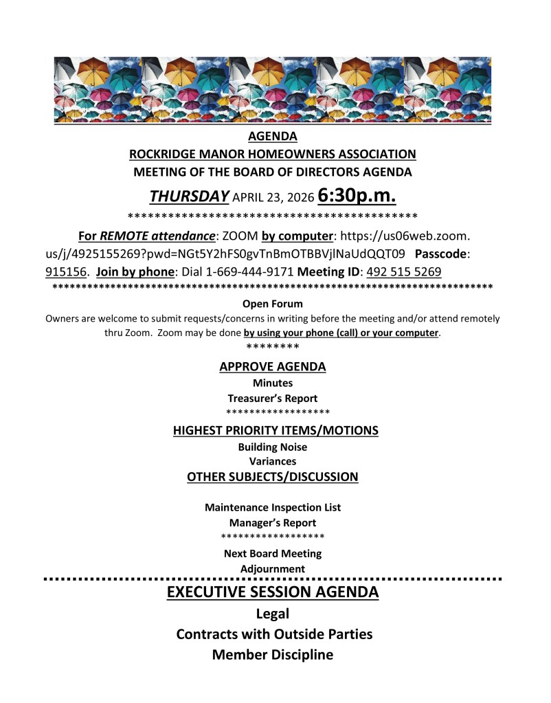 Agenda for the Thursday April 23 Board Meeting On April 18, 2026 By Rockridge Manor HOAIn Agendas, HOA Business Share this: Share on X (Opens in new window) X Share on Facebook (Opens in new window) Facebook Like Loading...