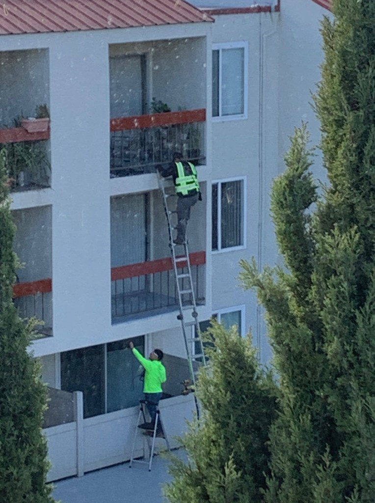 The 2 inspectors, clearly identified by bright green vests, will be using ladders to access these 10 balconies from the outside. They will not enter through the units. They will be quickly taking small samples of the balcony structure.
