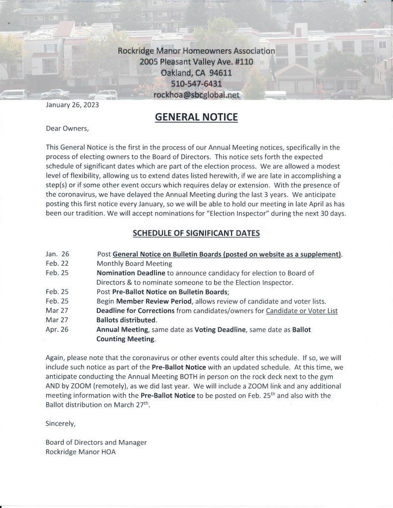 If you intend to run for the Board of Directors, you must notify the Manager of your candidacy by Sunday March 31. You may email the office or slip your candidacy announcement under the office door.