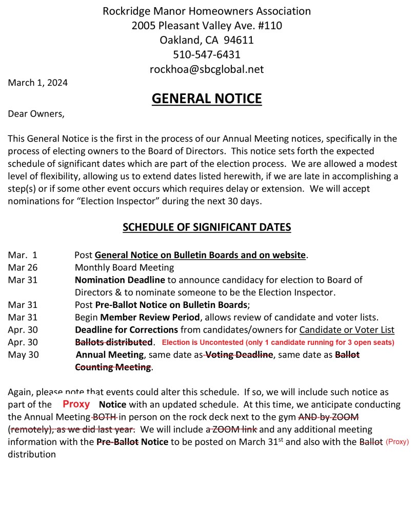Since this is an uncontested election, we will be distributing Proxies instead of Ballots. WE NEED AS MANY OWNERS AS POSSIBLE TO RETURN THEIR PROXIES SO WE CAN REALIZE A QUORUM OF OWNERS REPRESENTED, WHICH ALLOWS US TO HOLD THE ANNUAL MEETING.”